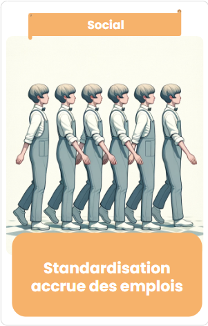 L’adoption généralisée d’outils d’IA peut conduire à une standardisation des modes de travail et des emplois. En effet, les IA fonctionnent à partir de processus définis et de données d’entraînement, ce qui incite les entreprises à uniformiser leurs procédures pour mieux les automatiser.