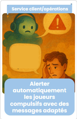 Une fois les comportements à risque identifiés, il faut agir. L’envoi automatique de messages personnalisés peut inciter le joueur à prendre une pause ou à réfléchir à ses habitudes. L’objectif est d’assumer une responsabilité sociale, de répondre aux obligations légales et de préserver une relation de confiance avec les clients. Une version simple consiste à configurer GPT pour envoyer des messages standard déclenchés par des seuils fixes (ex. “Vous jouez depuis 3h, il est peut-être temps de faire une pause”). En version avancée, les messages s’adaptent au profil, à l’historique de jeu et au ton le plus approprié (empathique, pédagogique, ferme), ce qui les rend plus efficaces.