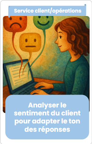 Un client peut arriver frustré, en colère ou au contraire satisfait et enthousiaste. L’analyse de sentiment permet de détecter cette tonalité et d’adapter le style de la réponse. L’objectif est de rendre l’échange plus humain, d’apaiser les tensions et de renforcer la fidélité en montrant de l’empathie. En version simple, GPT peut être prompté pour “analyser le ton du message du client et répondre de manière adaptée”. Cela fonctionne déjà bien pour distinguer colère, frustration ou satisfaction. En version avancée, un module de sentiment analysis dédié attribue un score au message (positif, neutre, négatif, avec intensité). GPT s’appuie ensuite sur ce score pour ajuster sa réponse : excuses proactives, explications détaillées, ton plus chaleureux ou plus factuel selon la situation.