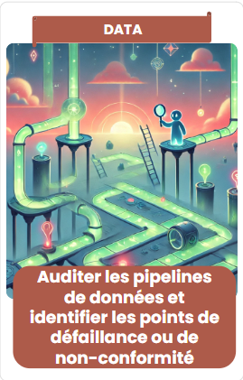 Auditer les pipelines de données et identifier les points de défaillance ou de non-conformité a pour objectif de garantir la fiabilité et la traçabilité des flux de données. Avec une simple licence GPT, on peut imaginer un assistant connecté aux logs qui aide à interpréter les erreurs et à signaler des anomalies visibles, comme des temps d’exécution anormaux ou des champs systématiquement vides. Dans une version plus avancée, on met en place un moteur d’audit automatisé avec des tests unitaires de pipelines, en s’appuyant sur des outils comme Great Expectations ou dbt test, et renforcé par un modèle d’IA capable de prioriser les erreurs et de suggérer des corrections adaptées.