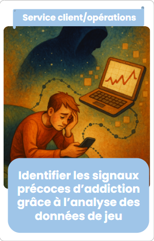 Dans les environnements de jeu, la responsabilité sociale et réglementaire impose de surveiller les comportements à risque. Les signaux précoces incluent des sessions de jeu très longues, des dépôts répétés en peu de temps, ou l’absence de pauses régulières. L’objectif est de détecter en amont les comportements d’addiction afin d’agir avant que la situation ne devienne problématique. Avec GPT seul, on peut déjà analyser des historiques anonymisés et mettre en avant les joueurs présentant des anomalies. En version avancée, des modèles de machine learning sont entraînés sur de larges volumes de données pour identifier des patterns subtils. GPT intervient alors pour générer des alertes compréhensibles, expliquer les signaux détectés et aider les équipes conformité à interpréter les résultats.